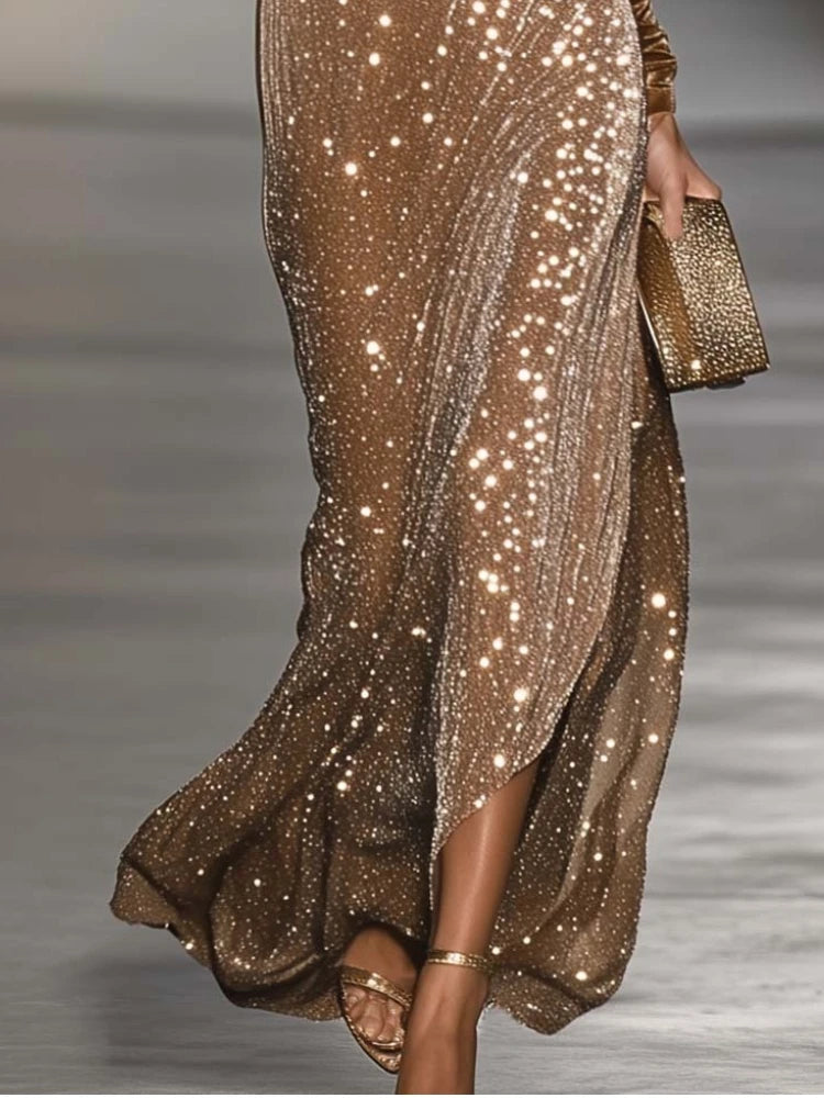 Brilla con eleganza in questo splendido abito da cocktail, pensato per serate indimenticabili. La parte superiore è realizzata in morbido velluto con maniche lunghe e scollo profondo a V, offrendo una vestibilità lussuosa e valorizzante. La parte inferiore presenta un design con paillettes scintillanti che catturano la luce in modo straordinario, creando un effetto glamour unico. Perfetto per cocktail, serate eleganti o occasioni speciali in cui vuoi mostrare stile e sicurezza.